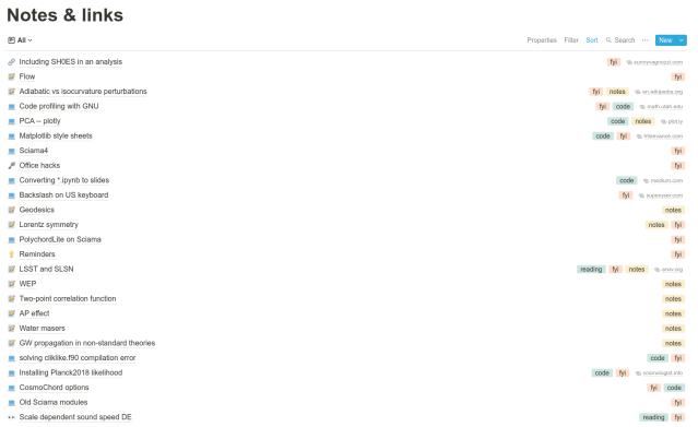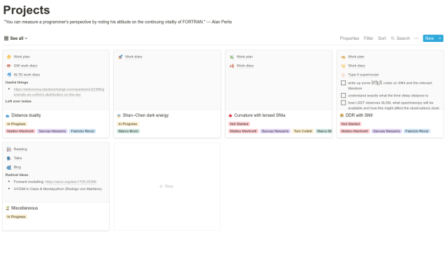 Another thing I really like about Notion is the emojis. I like assigning an emoji theme to a project, as you can see in the image below. For example, the distance duality project has a fish theme, as we were originally planning to do some Fisher forecasts.
